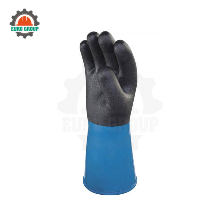 Bề mặt ngoài phủ PVC/nitrile cao cấp chống thấm nước, dầu và dung dịch hóa chất thông thường. Lòng bàn tay có kết cấu nhám tăng độ bám khi thao tác trong môi trường ẩm lạnh.