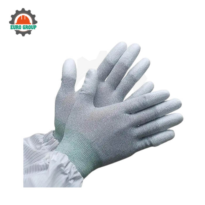 Găng tay được dệt từ Polyester kết hợp sợi Carbon Micro mật độ cao giúp phân tán điện tích nhanh chóng thay vì tích tụ trên bề mặt. Phần đầu ngón tay phủ PU tăng độ bám, hỗ trợ thao tác với chip, bo mạch và chi tiết nhỏ.